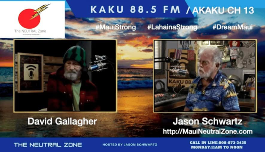 Jason Schwartz welcomes longtime Maui media personality David Gallagher to the Maui Neutral Zone for the show’s first 2024 broadcast — “Anything BUT Neutral.” Airing on KAKU 88.5 FM and Akaku Channel 55, the episode blends humor, history, and hard truths.